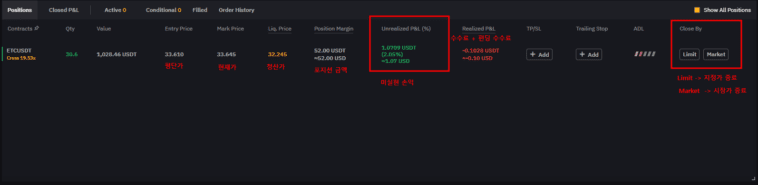 선물 거래 포지션 체결 시, 포지션 창입니다.
