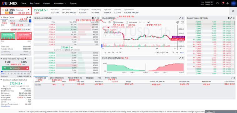 선물 거래 창에 들어오셨는데요. 선물 거래가 처음이신 분들, 혹은 비트맥스 선물 거래를 처음 이용하시는 분들을 위해 기본적인 인터페이스 설명을 위 사진에 첨부하였습니다.