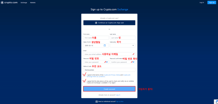 위 배너를 누르시면 다음과 같은 크립토닷컴 회원가입 창이 뜨는데요.