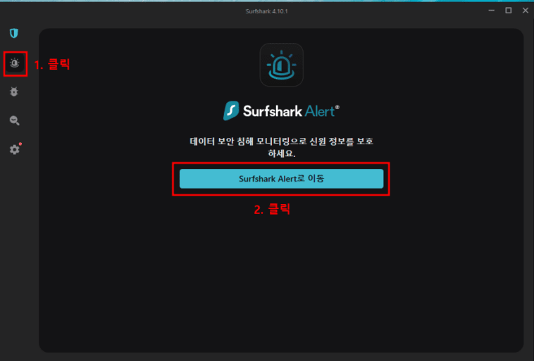 먼저 Surfshark VPN 앱을 켜신 후 왼쪽 위에서 두번째 버튼을 클릭하신 후 (Surfshark Alert로 이동) 버튼을 클릭해주세요.
