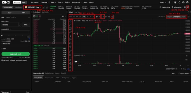 선물 거래 창으로 들어오셨는데요. OKX가 처음이신 분들, 혹은 선물 거래가 처음이신 분들을 위해 기본적인 인터페이스 설명을 위 사진에 첨부하였습니다.
